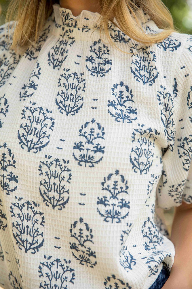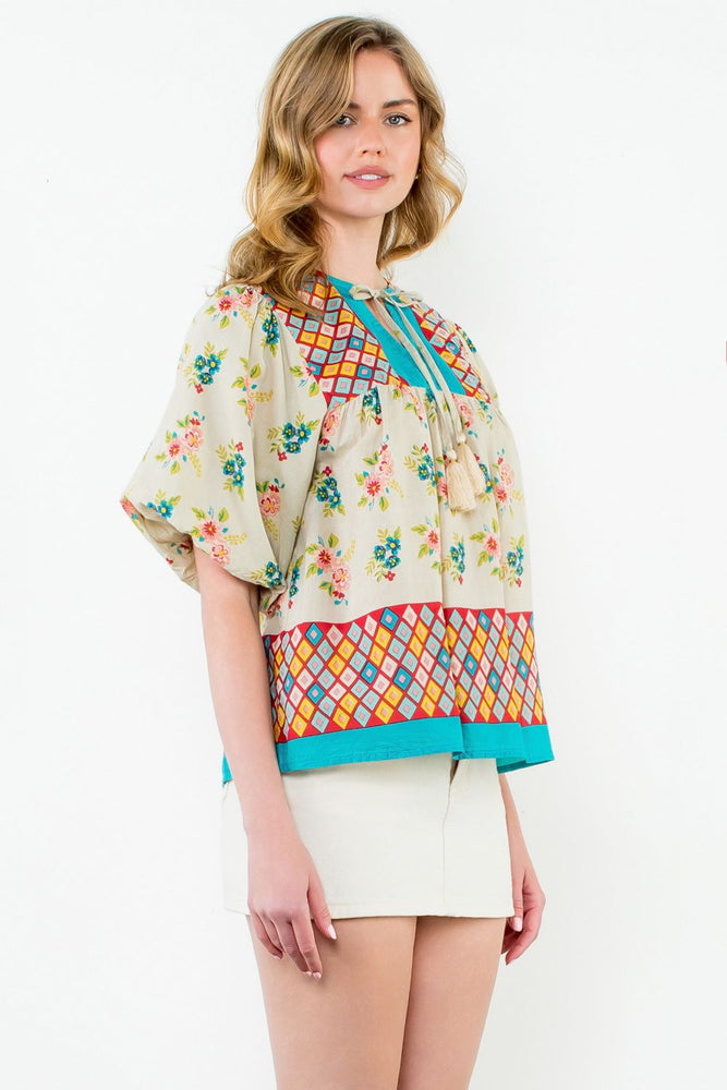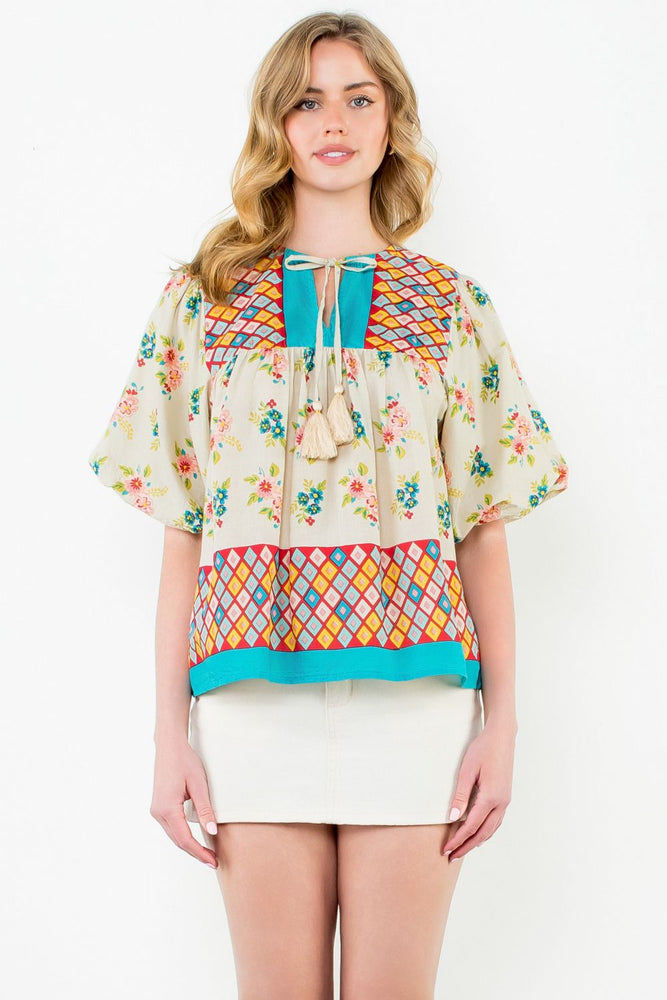 PUFF SLEEVE FLORAL TASSEL TIE TOP